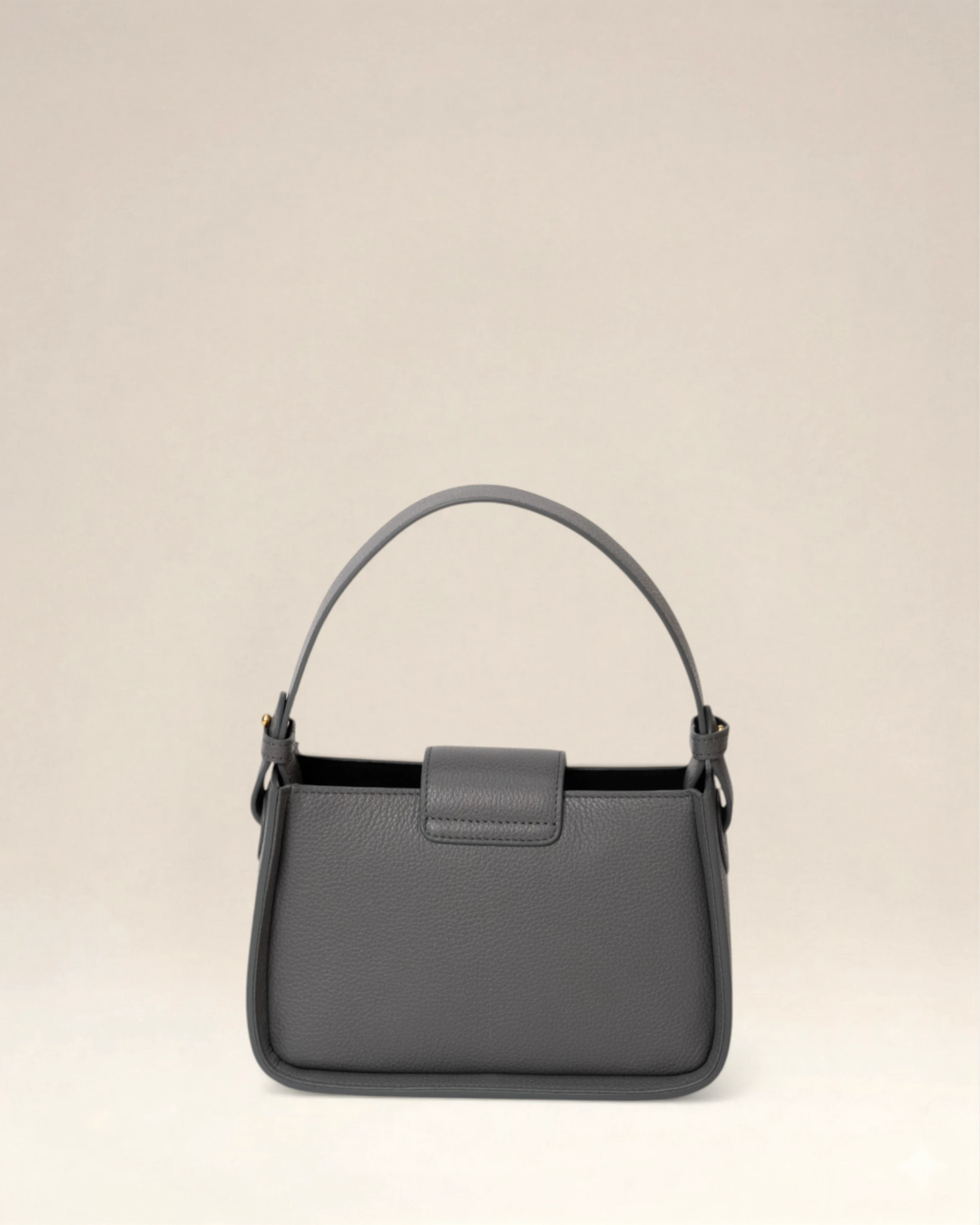 Sac en cuir vachette embosse graine, double en agneau velours, un compartiment central avec une poche plaquée et anse, porté main. Métallerie doree Dimensions : 21,5*13*6