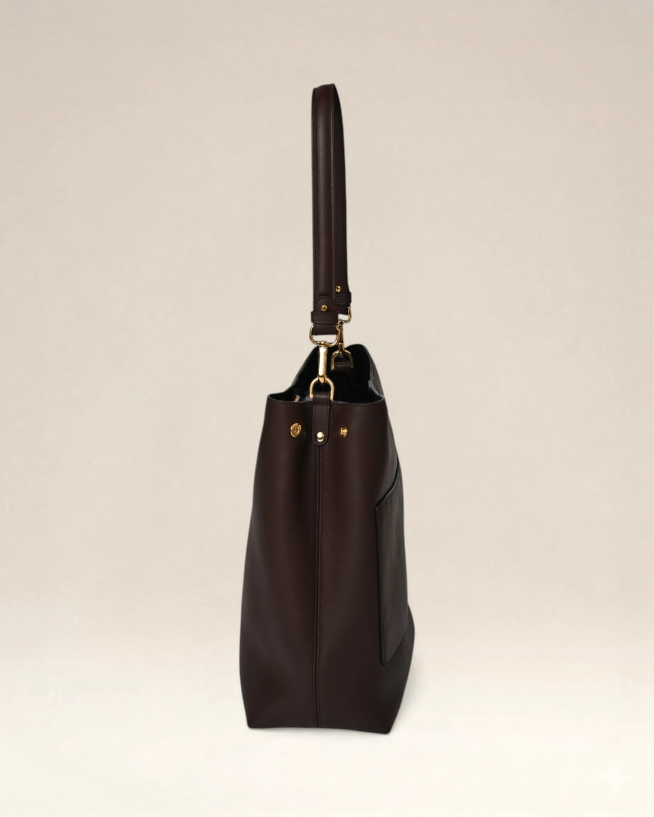 Sac en cuir vachette embosse graine, double en coton et agneau velours, un compartiment central, une poche au dos, une poche plaquée intérieure avec zip et anse, porté epaule. Métallerie doree. Dimensions : 31*36*11,5
