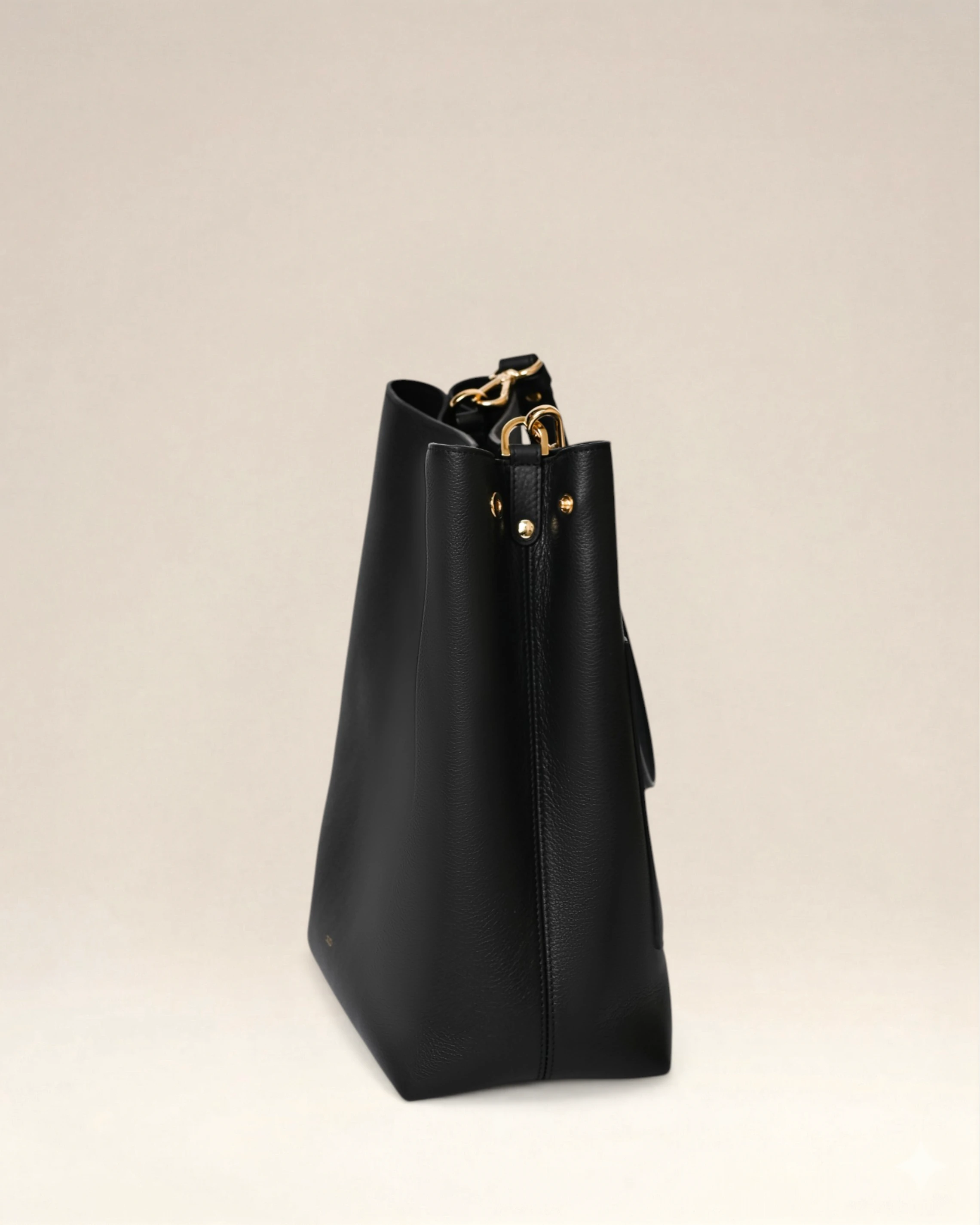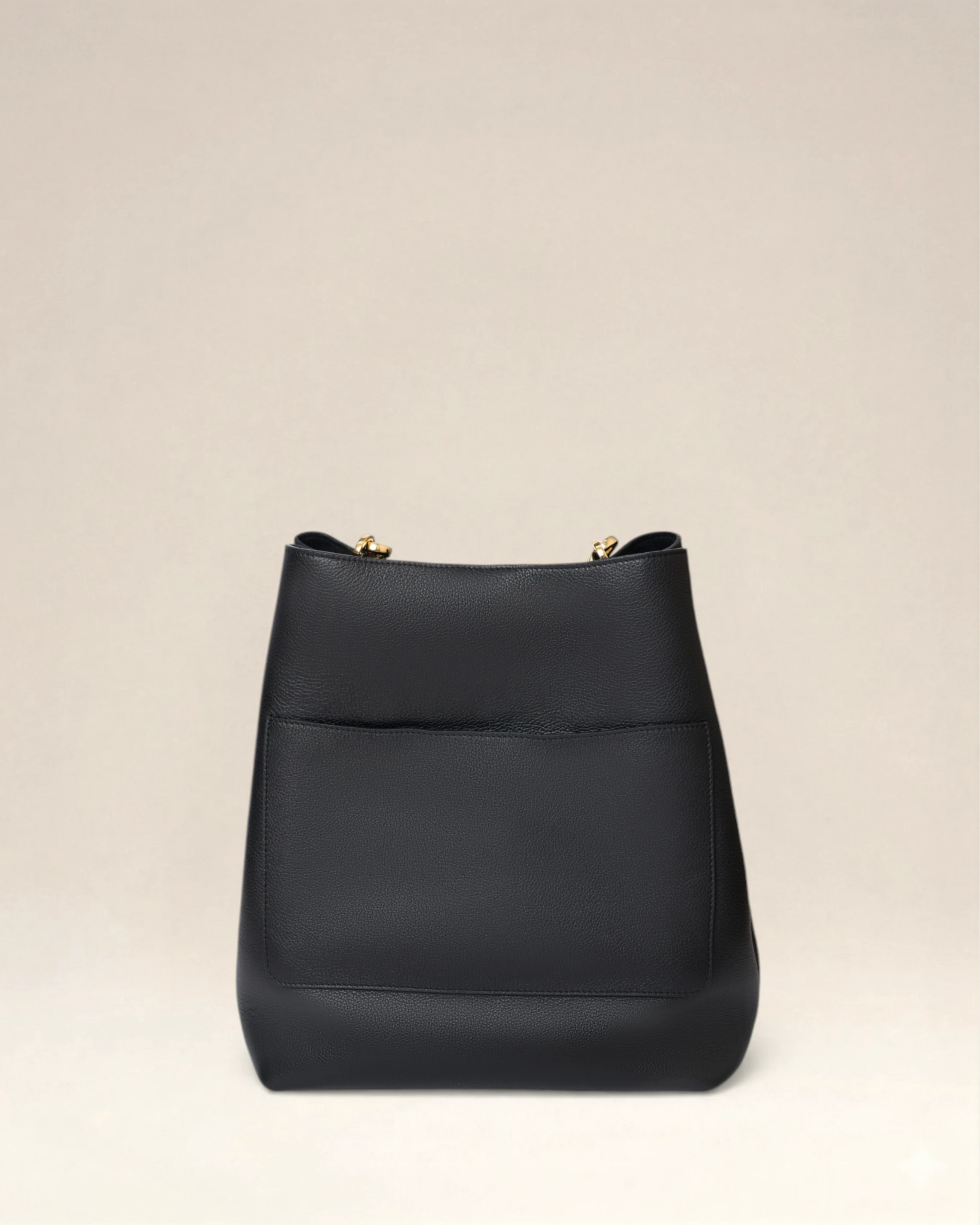 Sac en cuir vachette embosse graine, double en coton et agneau velours, un compartiment central, une poche au dos, une poche plaquée intérieure avec zip et anse, porté epaule. Métallerie doree. Dimensions : 31*36*11,5